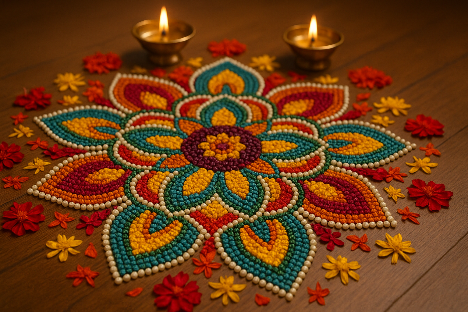 Handcrafted Rangoli & Torans — Brighten your doorways and sacred spaces with colorful, intricate rangoli designs and door hangings.